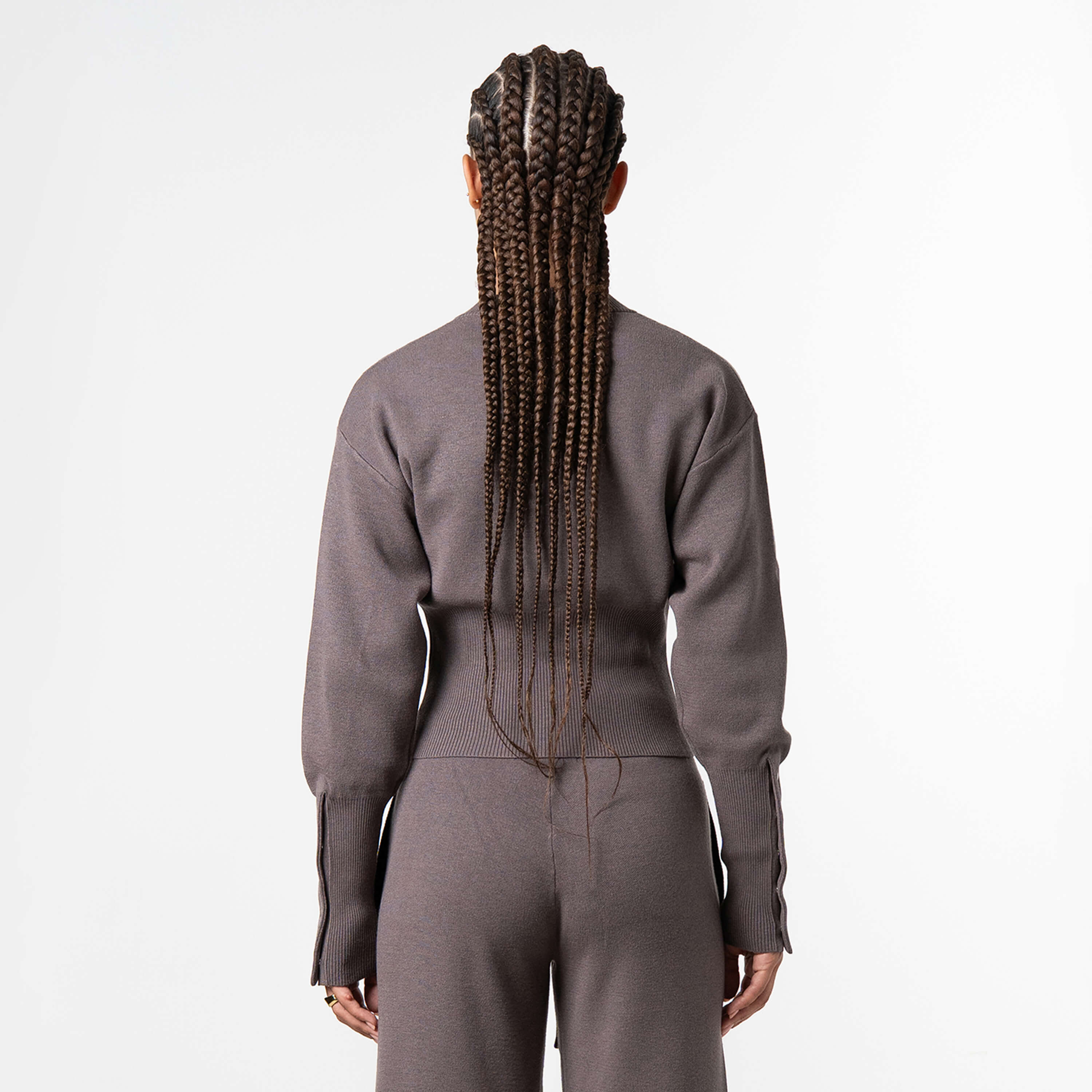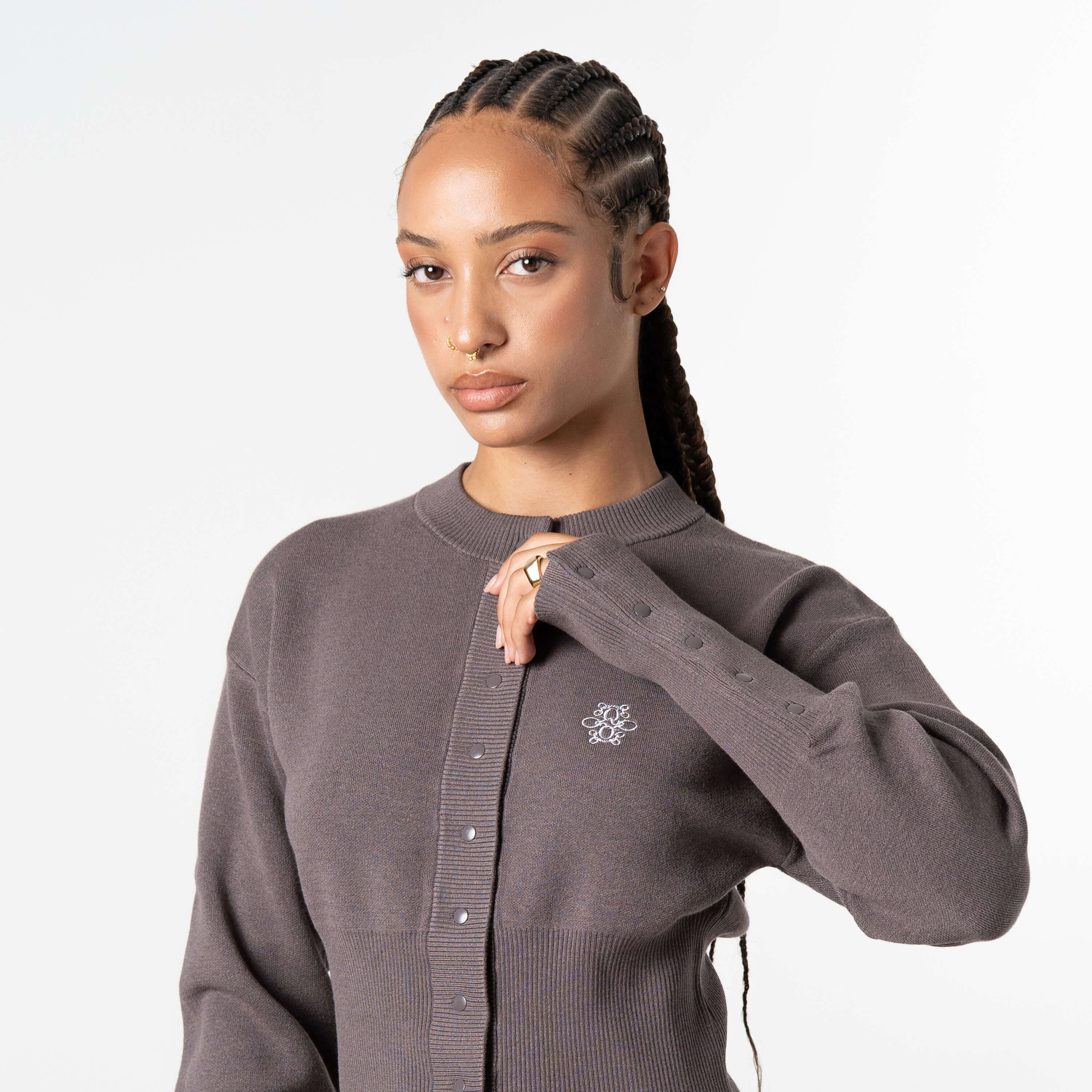 • The Chloe Knitted Cardigan flips the script on classic knitwear. With its cropped silhouette, bold snap-button closure, and extended cuff details, this piece isn’t here to play safe, it’s here to make noise.