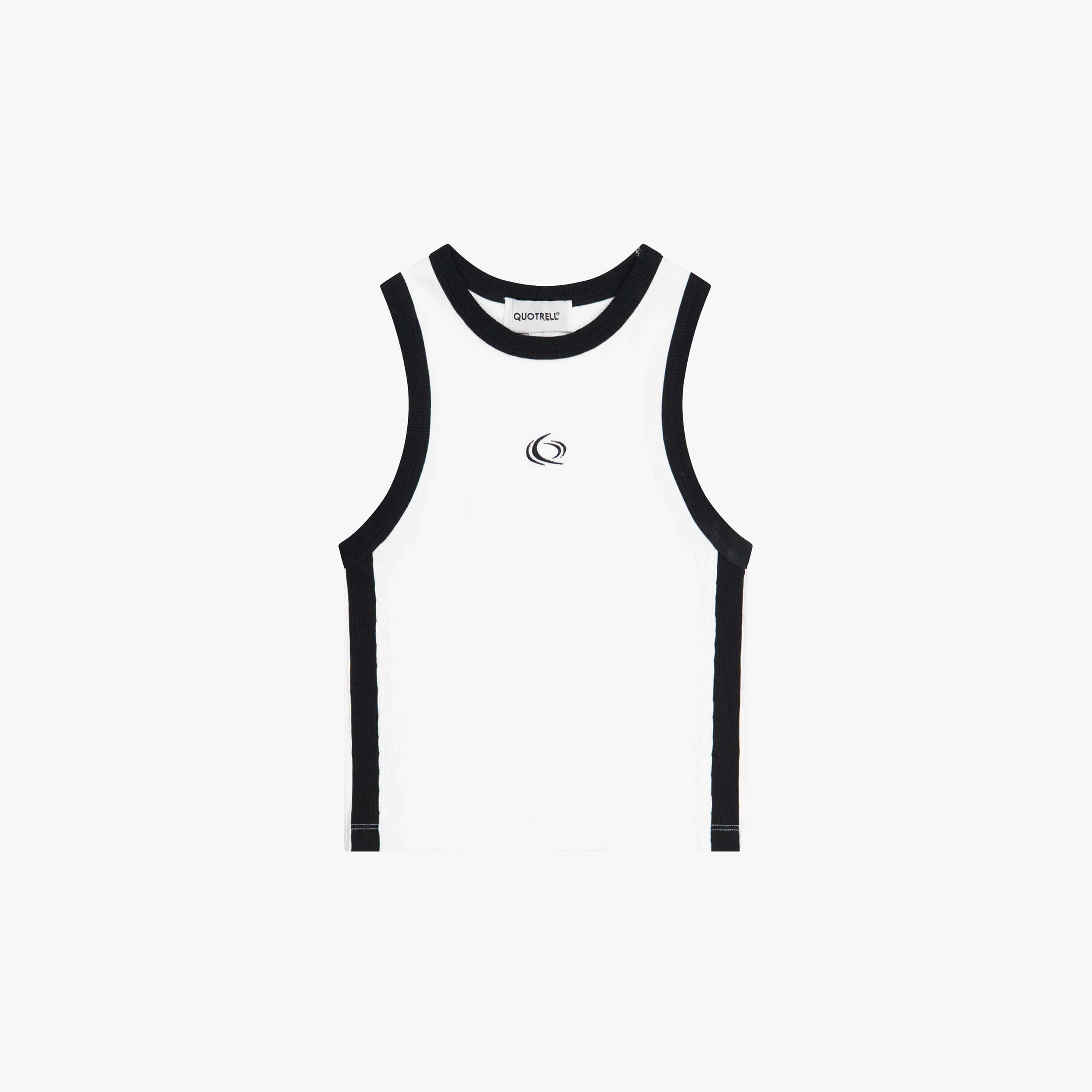The Skye Top features a regular fit crafted from ribbed stretch fabric for a comfortable, body contouring feel. Designed with a high neckline and sleeveless silhouette for a clean, athletic look. Contrasting side panels and trim add a sharp, sporty edge, while the subtle embroidered Quotrell logo at the chest delivers a refined branded finish. A modern essential that pairs effortlessly with denim, cargos, or track inspired pieces.