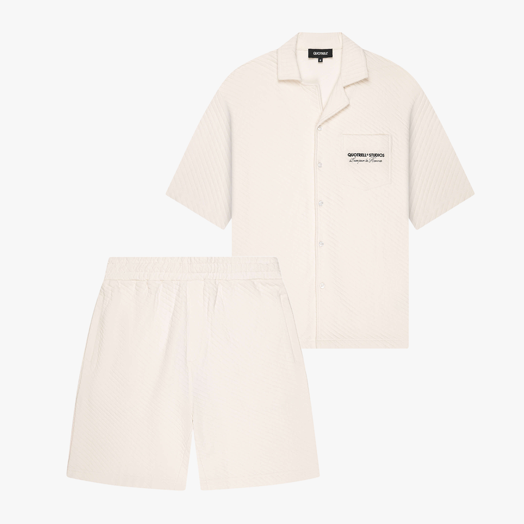 The Delhi Shirt adds a premium touch with a small embroidered artwork on the chest featuring the bold text "Luxe pour les hommes", while the Delhi Shorts complete the look with a subtle Quotrell logo on the back pocket.